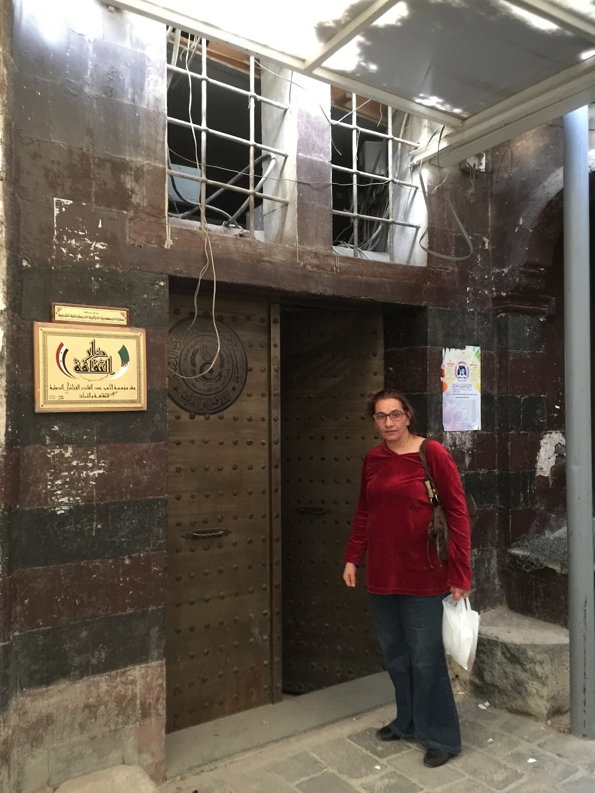 Passée la mosquée de Sayyidah Rouqayya en nous dirigeant vers Bab Faradis, nous empruntons la première rue à droite Naqib al-Asharaf. Une centaine de mètres plus loin, la porte de la maison de l'émir Abd el-Kader… La maison de l'émir n'est actuellement pas habitée, sinon par une belle et nombreuse famille de chats et leur soignante. Pendant une dizaine d'années elle a été offerte à une association qui en a fait une maison de retraite pour personnes âgées. Puis l'État algérien a promu cette maison patrimoine historique confié au ministère de la Culture mais n'est pas encore pas vraiment ouverte au public… Nous avions la chance d'être accompagnés ce jour-là d'une Damascène descendante de ces Algériens qui suivirent Abd el-Kader dans son exil en Syrie… Appel téléphonique à un arrière-arrière-petit-fils de l'Émir et la porte de la maison nous fut aimablement ouverte. C'est avec émotion que nous pûmes y pénétrer et y circuler librement dans toutes ses parties et, témoignage extrême de sympathie, jusque dans les privés… C'est avec peine que nous pûmes aussi constater - ici aussi - les dégâts récents causés par plusieurs tirs de mortier de groupes terroristes islamiques ayant investi les banlieues proches de Damas et visant la mosquée chi'ite de Sayyidah Rouqayya tout proche…