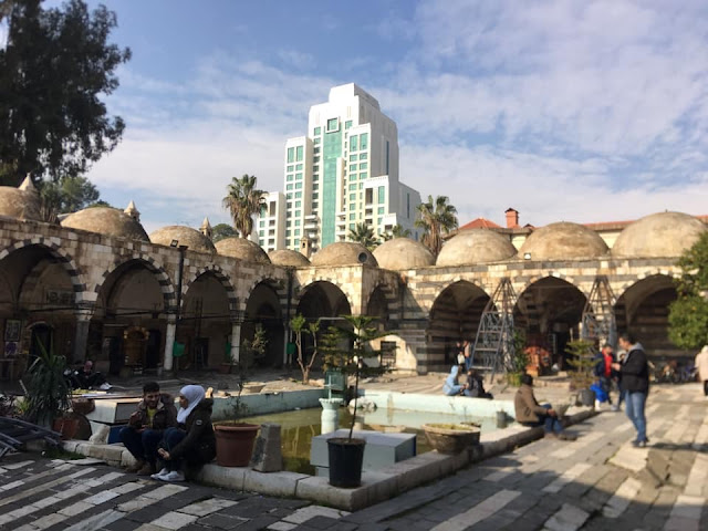 Comment ne pas succomber au charme de cet ensemble, celui de la Takiya al-Soulaymaniya ?… Un espace chargé d'Histoire… L'un des lieux les plus beaux de Damas par son architecture, ses jardins… Un des lieux où chacun, résident ou simplement de passage, rencontrera nombre d'artisans et n'aura que l'embarras du choix dans ses acquisitions… Immanquablement lors de chacun de nos multiples voyages en 2015, 2016, 2017 et encore en ce mois d'avril 2018 avec la Communauté Syrienne de France nous y avons passé de longs moments, pour chaque fois de nouvelles découvertes… et toujours un excellent café !