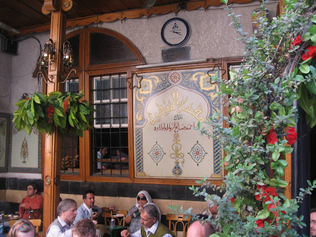 Bifurcation à l'ouest, et c'est l'esplanade de la mosquée des Omeyyades ; l'est c'est le souk al-Qabaqbieh, ses boutiques de souvenirs bon marché, puis tout à l'est après un crochet c'est la rue el-Noufara et son fameux café [مقهى النوفرة]…