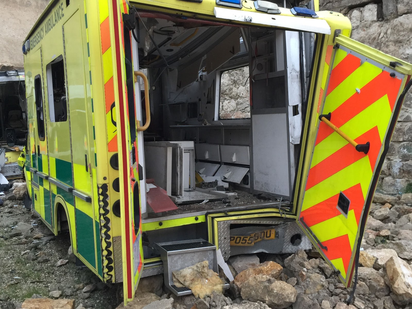 Épave d'une ambulance des Casques blancs. On reconnaît le cadre des enregistrement du petit Omran Daqneesh