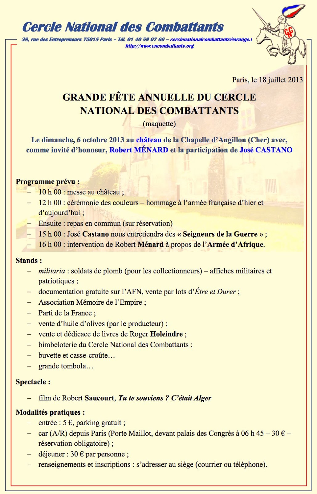 Le dimanche 6 octobre 2013 est organisée la Fête du Cercle national des combattants (CNC), sur le thème