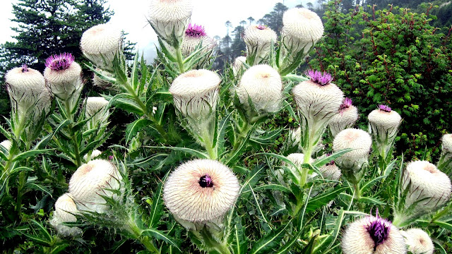 Arunachal Pradesh - Le col de Sela, à 13700 pieds, entre Bomdila et Tawang (tout à l'ouest sur la carte, près du Bhoutan)… C’est là qu’en juillet 2010, j’ai découvert ces superbes chardons des neiges… tellement proches et éloignés des chardons des steppes de feu du Sahel, délices de nos bourricots… Les rhododendrons ci-dessous ont été photographiés à la même latitude, au Bhoutan, en mars au sortir de l’hiver… en juillet leurs fleurs avaient partout disparu…
