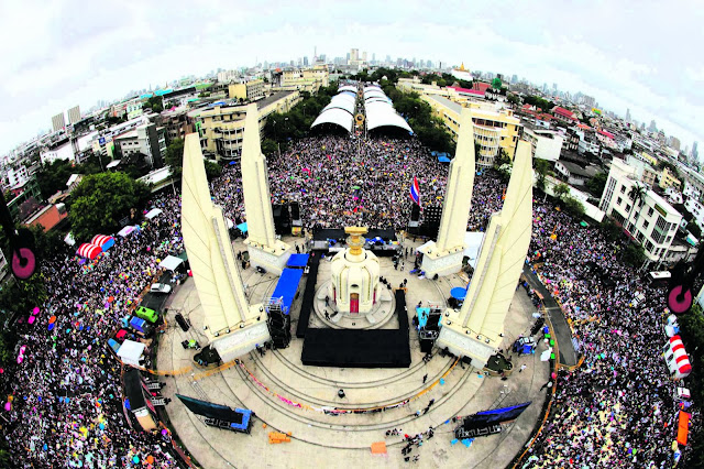 Des dizaines, voire plusieurs centaines de milliers de manifestants se sont rassemblés ce dimanche 24 novembre à Bangkok pour une immense démonstration de force contre le gouvernement dirigé par Yingluck, la petite sœur de Thaksin Shinawatra. « Idiote, démissionne ! » était l'un des slogans le plus souvent scandé par une foule enjouée… "Sanouk" [amusons-nous !], ce parti pris de rire en toute circonstance n'abandonne jamais les Thaïlandais, même dans les heures les plus graves. Les porte-parole du mouvement anti-Shinawatra ont promis à leurs partisans que le régime Shinawatra serait renversé avant la fin du mois. Les participants sont résolus à rester sur place toute la nuit, ainsi de nombreuses manifestations sont encore prévues ce lundi déployées à travers toute l'agglomération, une douzaine de sites seront particulièrement visés, dont plusieurs ministères, les sièges de l'armée et de la police nationale, et plusieurs chaînes de télévision.