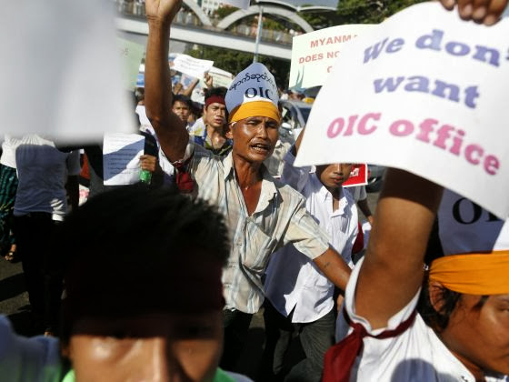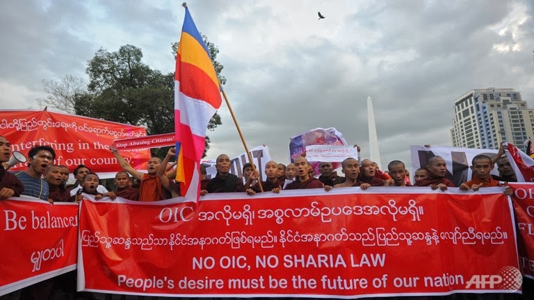 Yangon, 13 novembre 2013 - « Dehors les musulmans ! » : c’est par ce salut unanime contre une ingérence extérieure que des centaines de bouddhistes à Yangon, Mandalay, Sittwe… ont accueilli, ce 13 novembre en Birmanie, une délégation de l’Organisation de la conférence islamique (OIC) prétendant interférer dans les affaires intérieures de la Nation birmane… La délégation de l’OCI, menée par son secrétaire général le turc Ekmeleddin Ihsanoglu, comprend des ministres et représentants d’Indonésie, de Malaisie et du Bangladesh, tous trois voisins de la Birmanie, mais aussi de Turquie, d’Arabie Saoudite, d’Égypte et de Djibouti.
