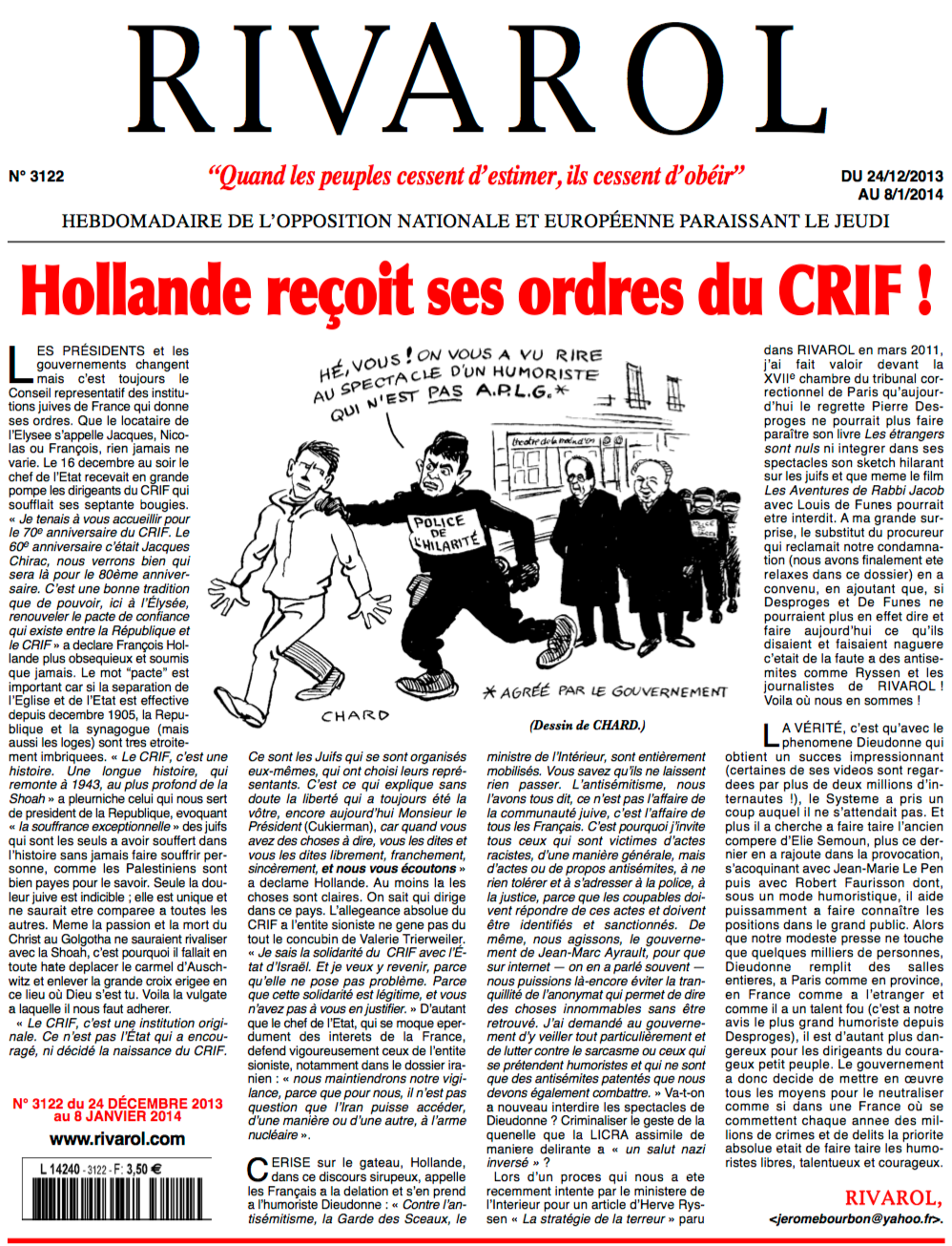 Cerise sur le gâteau, Hollande, dans ce discours sirupeux, appelle les Français à la délation et s’en prend à l'humoriste Dieudonné : « Contre lʼantisémitisme, la Garde des Sceaux, le ministre de l'Intérieur, sont entièrement mobilisés. Vous savez qu'ils ne laissent rien passer. L'antisémitisme, nous l'avons tous dit, ce n'est pas l'affaire de la communauté juive, c'est l'affaire de tous les Français. C'est pourquoi j'invite tous ceux qui sont victimes d'actes racistes, d'une manière générale, mais d'actes ou de propos antisémites, à ne rien tolérer et à s'adresser à la police, à la justice, parce que les coupables doivent répondre de ces actes et doivent être identifiés et sanctionnés. De même, nous agissons, le gouvernement de Jean-Marc Ayrault, pour que sur Internet — on en a parlé souvent — nous puissions là-encore éviter la tranquillité de l'anonymat qui permet de dire des choses innommables sans être retrouvé. J'ai demandé au gouvernement d'y veiller tout particulièrement et de lutter contre le sarcasme ou ceux qui se prétendent humoristes et qui ne sont que des antisémites patentés que nous devons également combattre. » Va-t-on à nouveau interdire les spectacles de Dieudonné ? Criminaliser le geste de la quenelle que la LICRA assimile de manière délirante à « un salut nazi inversé » ?
