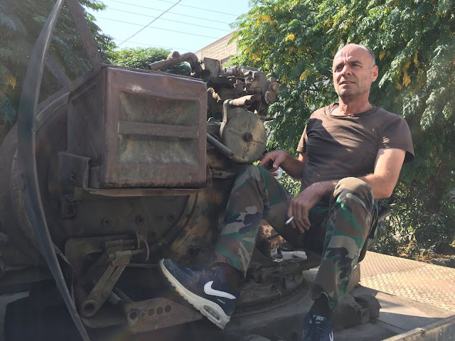 | Devant le quartier général des forces de la Défense Nationale à al-Suqalaybiya… Ici encore l'ambiance est manifestement à la détente, après l'élimination des poches djihadistes les plus proches… |